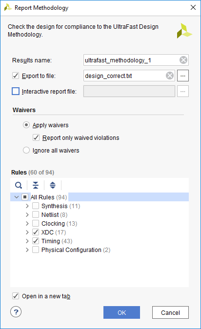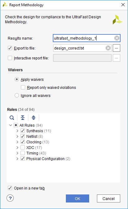 - report_methodology -name ultrafast_methodology_2 -file design_correct.txt -checks {PDRC-204 PDRC-190 CLKC-54 CLKC-53 CLKC-9 CLKC-5 CLKC-38 CLKC-37 CLKC-36 CLKC-35 CLKC-4 CLKC-18 CLKC-3 CLKC-2 CLKC-1 REQP-1959 LUTAR-1 HPDR-1 NTCN-1 CKLD-2 CKLD-1 DPIR-1 CKBF-1 SYNTH-14 SYNTH-13 SYNTH-12 SYNTH-11 SYNTH-10 SYNTH-9 SYNTH-16 SYNTH-15 SYNTH-6 SYNTH-5 SYNTH-4}