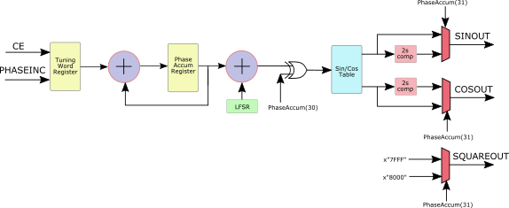 This is an waveform generator that uses DDS techniques to generate variable frequency sine, cosine and square wave outputs. A zip archive that includes all source files, testbenches and a user guide is available from my git hub page.
